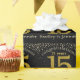Number 15 in simulated glitter gold with falling diamonds on solid black. Congratulations in open face off-white font and 15 years in golden yellow solid font. Personalise with recipients names or personal message.
