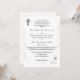 Design front features a pure white background to the elegant image of a silver crucifix at top left corner. Bottom right corner displays the image of the Holy Eucharist suspended above chalice with the image joined wedding rings displayed beside it. Following the traditional format for a Catholic wedding invitation, text is featured in an elegant black font. The names of bride and groom, along with event are displayed in a graceful Nuptial font. Design is accented by an elegant flourish aligning the left and right sides.