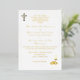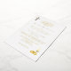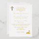 Design front features a pure white background to the elegant image of a silver crucifix at top left corner. Bottom right corner displays the image of the Holy Eucharist suspended above chalice with the image joined wedding rings displayed beside it. Following the traditional format for a Catholic wedding invitation, text is featured in an elegant silver-colored print. The names of bride and groom, along with event are displayed in a graceful Nuptial font. Design is accented by an elegant flourish aligning the left and right sides