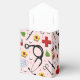 Creative nurse party favour box featuring healthcare supplies and flowers design on pink background.