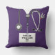Creative nurse pillow featuring purple hospital scrubs, a stethoscope, and a Swiss Army knife. Edit text to add name and professional credentials.