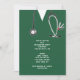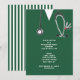 Creative nursing school grad party invites or announcements featuring green hospital scrubs, funny Swiss army knife and stethoscope art.