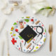 Nursing school graduation party plates featuring healthcare supplies and classic black and gold grad cap.