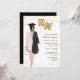 Nurse Graduation Party Invitation. The perfect Nurse Invitation for your daughter, niece, mother, aunt, cousin, or friend who just graduated and is now officially a nurse. Female Nursing School Graduation Invitation for grad parties celebrating women who just graduated from nursing school. Celebrate the new Registered Nurse with this elegant nursing graduation invitation! Featuring a beautifully illustrated portrait of a light skin woman with dark hair in low bun. The nurse grad is wearing a stylish white dress, a black graduation robe draped over her shoulder, and a matching black graduation cap. She holds gold foil style balloons with the letters RN in one hand and a stethoscope in the other hand. Accented with shimmering gold confetti, it perfectly captures the joy and excitement of her big achievement.