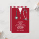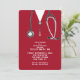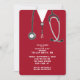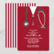 Creative nursing school grad party invites featuring red hospital scrubs and stethoscope.