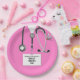 Pink medical themed party plates for nursing school graduation party or hospital events. Edit text to personalise.