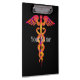 Clipboard is designed with a large hot pink, purple and faux goldish caduceus symbol on the front and back with your name on centre area in white typography.