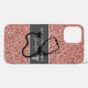 Protect your phone in style with this Nurse Practitioner Rose Gold Glitter Personalised  iPhone 12 Case.  It is designed with pink faux glitter background and grey horizontal stripe on the centre.   A black stethoscope silhouette and white caduceus symbol with "nurse practitioner" is in white minimal print lettering.  Name is in stylish white hand lettered script.  CLICK "PERSONALIZE TEMPLATE" OPTION AND ENTER NAME.