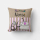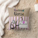 Unique Nurse Retirement Pillow, nurse cap, stethoscope with pink polka dots and stripes on a light brown background. Back of pillow in coordinating colours.