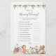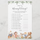 Nursery rhymes themed baby shower what is mummy wearing game card features a watercolor nursery rhymes illustration and watercolor greenery eucalyptus garland and elegant handwritten style font.