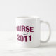 On one side of this mug in bold reddish-purple curved text it reads: "NURSE 2011". In the middle of this text in smaller, customisable text are the words "class of". Give this mug a more personal touch by adding your name or your school name to the opposite side! This design can be used on any of a number of different mugs, glasses and steins. For all those who will work so hard to be 2011 graduates from nursing school.