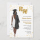 Nursing School Graduation Party Invitation. Nurse Invitation for your daughter, niece, mother, aunt, cousin, or friend who is graduating from nursing school and is now officially a nurse. Female Nursing School Graduation Invitation for grad parties celebrating women who just graduated from nursing school. Celebrate the new Registered Nurse with this elegant nursing graduation invitation! Featuring illustrated portrait of a dark skin woman with short hair. The nurse grad is wearing a stylish white dress, a black graduation robe draped over her shoulder, and a matching black graduation cap. She holds gold foil style balloons with the letters RN in one hand and a stethoscope in the other hand. Accented with shimmering gold confetti, it perfectly captures the joy and excitement of her big achievement.
