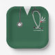 Creative nurse graduation party plates featuring green nursing scrubs, stethoscope and funny Swiss Army knife art. To personalise edit text to add nurse grad's name.