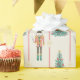 The Nutcracker Ballet Christmas wrapping paper features a nutcracker toy pattern with a cream background, a decorated christmas tree and pink Stripes for a classic elegant look.