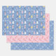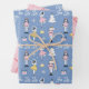 This Nutcracker Christmas wrapping paper features 3 separate, whimsical patterns in a pink, yellow and blue colour theme. Sheet 1: a nutcracker and dancing ballerina pattern; Sheet 2: candy-canes and snowflakes; Sheet 3: Fa la la pattern in blue and white. A unique and adorable giftwrap for the holidays!