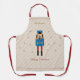 A Christmas apron in red, brown and green colours with an illustration of a Nutcracker, some stars and red dots ornaments on a striped brown background. You could use it for Xmas for your family or in your shop!