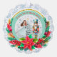 Description: Celebrate the magic of the holidays with this enchanting personalized Christmas ornament! Featuring a beautiful illustration of Clara from The Nutcracker ballet holding her beloved Nutcracker, alongside a festive Christmas tree and vibrant poinsettias, this ornament is a perfect keepsake. The front can be customized with a name (e.g., "Olivia as Clara") and the year, making it a truly unique memento. The reverse side carries a heartfelt "Merry Christmas! Wishing you a Happy and Healthy New Year. Love [Your Family Name]" message, surrounded by sparkling gold accents and a beautiful bokeh background. Crafted from a lovely teal and snowflake border, this ornament adds a touch of classic holiday charm to any tree. It's an ideal gift for ballet lovers, children, or families looking for a special way to commemorate the festive season.