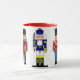 Combo coffee mug with red trim and five adorable nutcracker soldiers.