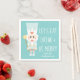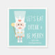 Level up your holiday party with these cute and personalised nutcracker christmas and holiday party paper napkins with a nutcracker standing at attention with a heart on it's blue hat, pink leggings and white boots while holding a yellow gold look sceptre. Aqua blue background with the words Let's Eat Drink and Be Merry. Perfect for a nutcracker themed christmas holiday party at home or corporate celebration. Artwork © Chrissy H. Studios, LLC. All rights reserved.