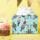 A cute and colourful pattern of nutcrackers, mistletoes, and bells with a baby blue background.