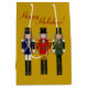 Christmas Nutcracker Trio -Three Nutcrackers standing side by side on top of a solid gold background. The first nutcracker is dressed in blue and white with gold embellishments. The centre nutcracker is dressed in red and gold with gold embellishments. The third nutcracker is dressed in green and white with silver embellishments. Each one of these nutcrackers are available separately on assorted Zazzle gifts and products. Choose any size gift bag available. Two text areas are in place for you to personalise with. Edit the text to say anything you like. Delete or clear the text areas that you do not want.