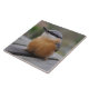 A close-up photograph of a slate blue and pale orange Eurasian Nuthatch, Sitta europaea, sitting on a garden table.
