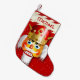 This red Christmas stocking features a nutcracker king cartoon with a gold crown. Use your own text to personalise it today for someone special.