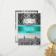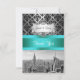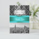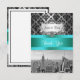 Customisable Invitations and accessories with an iconic view of the New York City skyline from the top of 30 Rockefeller Centre, featuring a black & white photo of the Empire State Building, lower Manhattan including the World Trade Centre. It also features a black damask pattern against a gradient silver grey background, and a turquoise ribbon. It also features a white gradient label in a silver look frame.