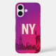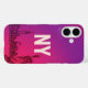 iPhone case featuring centred and reduced-size "NY" graphic, vibrant pink-purple gradient background, and black line art skyline with Statue of Liberty.