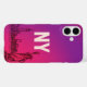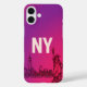 iPhone case featuring centred and reduced-size "NY" graphic, vibrant pink-purple gradient background, and black line art skyline with Statue of Liberty.