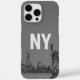 iPhone case featuring centred and reduced-size "NY" graphic, vibrant background, and black line art skyline with Statue of Liberty.