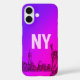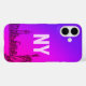 iPhone case featuring centred and reduced-size "NY" graphic, vibrant background, and black line art skyline with Statue of Liberty.