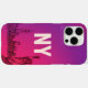 iPhone case featuring centred and reduced-size "NY" graphic, vibrant pink-purple gradient background, and black line art skyline with Statue of Liberty.