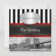 Elegant, stylish, chic customisable Invitations and accessories with an East River view of New York City's iconic Brooklyn Bridge and Municipal Building with a boat passing by. It also features a black and white stripe pattern, a black and red ribbon and a white gradient label with your choice of a silver or gold colour pearl frame. Image is in a black & white.