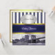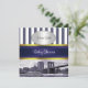 Customisable Invitations and accessories with an East River view of New York City's iconic Brooklyn Bridge and Municipal Building with a boat passing by. tint. It also features a navy blue and white stripe pattern, a navy and gold ribbon and a white gradient label with your choice of a silver or gold colour pearl frame. Image is in a blue & white tint. The reverse is framed in gold.