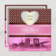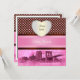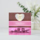 Customisable Invitations and accessories with an East River view of New York City's iconic Brooklyn Bridge and Municipal Building with a boat passing by. It also features pink polka dots on a brown background, a pink and brown ribbon and a white gradient label in your choice of a gold, or silver look pearl frame. the image is in shades of pink on a distressed background.