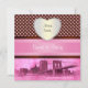 Customisable Invitations and accessories with an East River view of New York City's iconic Brooklyn Bridge and Municipal Building with a boat passing by. It also features pink polka dots on a brown background, a pink and brown ribbon and a white gradient label in your choice of a gold, or silver look pearl frame. the image is in shades of pink on a distressed background.