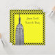 Customisable invitations and accessories with an iconic view of the New York City skyline, featuring a black & white etched look photo of the ESB against a black and yellow chequerboard background design inspired by city cabs .