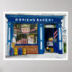 A watercolor of a colourful, nostalgic bakery in Ireland. The white and blue building contrasts with the colourful array of goods in the shopwindow and the doorway.