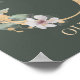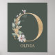 Letter O monogram floral. Letter O in golden brown texture accented with green watercolor compound leaves, flower blossoms and gold dust. Personalised with name in matching font.