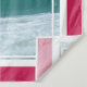 Stunning photo collage taken in Oahu, Hawaii featuring a sandy beach, palm trees, a lavender sunset over the horizon, and an aqua blue ocean.