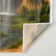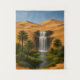 A captivating artwork depicting a cascading waterfall emerging between golden sand dunes, surrounded by lush palm trees and a vibrant green oasis. The painting reflects the contrast of nature between arid desert and flourishing greenery, creating a serene scene that transports the viewer to a world of tranquillity and calm, where sand and water meet in stunning visual harmony.