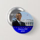 Barack Obama standing before the White House with patriotic red white and blue banner commemorating the inauguration date.
