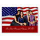 Oil painting President Barack Obama and family with the American flag behind them.