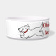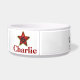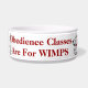 obedience classes are for Wimps dog customisable bowl. This funny red and white dog food or water bowl has the text 'Obedience Classes Are For Wimps' with a funny cartoon dog running around the bowl and a red and gold star with the anarchy symbol on the back. Perfect for all dog or pet lovers especially those with a naughty dog. Add your own pet's name for a fully customisable and personalised pet or dog gift.