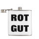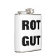 Obvious label flask says ROT GUT in big, plain, simple, easy to read letters so that you never mistake your fruit flavoued soft drink flask for your booze. (Those sugary soft drinks will kill you!) Great way to carry your high octane hooch around with you.