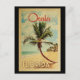 A uniquely retro mid-century modern Ocala Florida art print in vintage travel poster style. It features a curved palm tree on sandy beach with ocean under a blue cloudy sky.