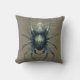 A square white throw pillow featuring a detailed dark biomechanical arachnid with complex textures and a single yellow eye at its center. The intricate teal and black spider is overlaid upon faint, occult circular glyphs and abstract geometry with subtle paint splatters and sketch marks. The back of the pillow is solid black. Perfect for gothic, alternative, and edgy industrial home decor. Durable woven polyester fabric.