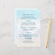 Wedding menu with ocean beach background. Light blue water, sea foam, and beach sand is the background for custom, teal blue text. The names of the bride and groom are in the centre of the paper. Customise four sections with menu information.