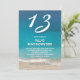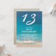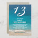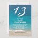 Custom, beach birthday party invitations for kids of any age. Created for a tween or teenage girl, with big numbers at the top for her age, over turquoise water lapping at the sandy shore. Printed, white shadow text makes her age and name pop off the page. Easily add all party information in the paragraph template provided. The back of the card has an image of beach sand.